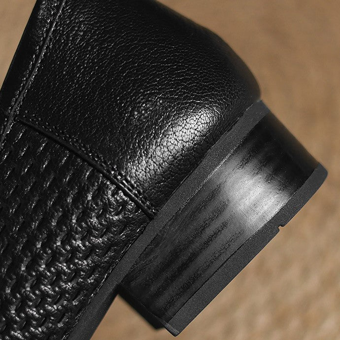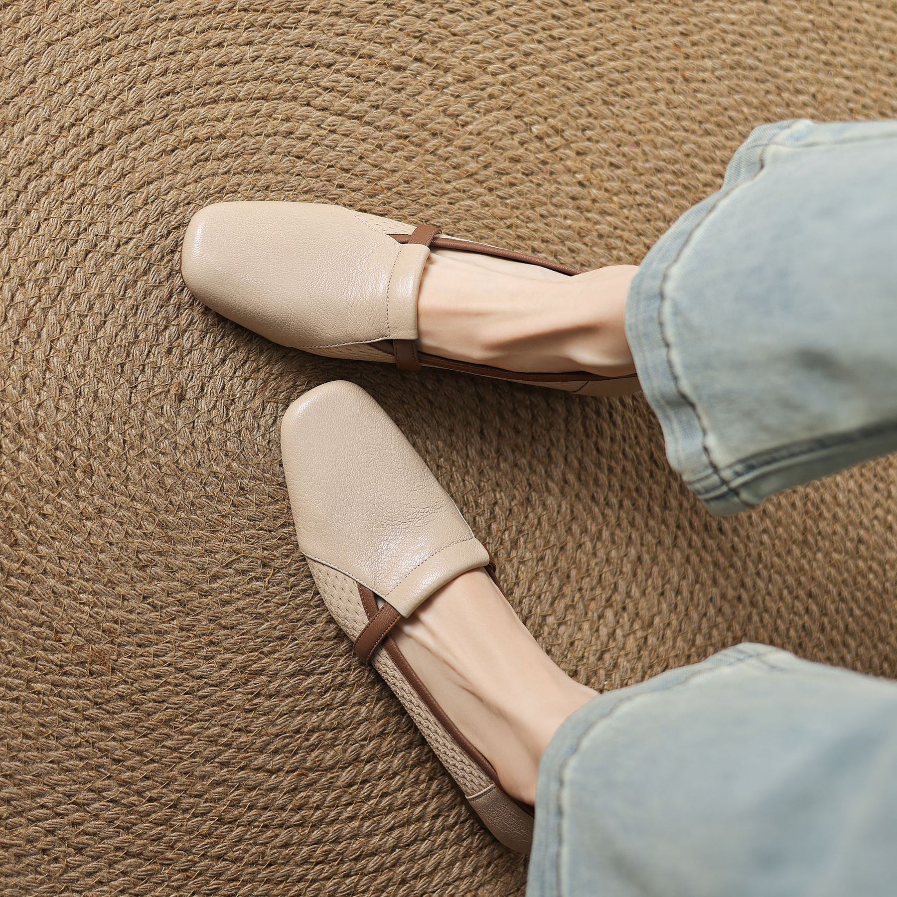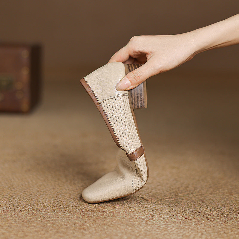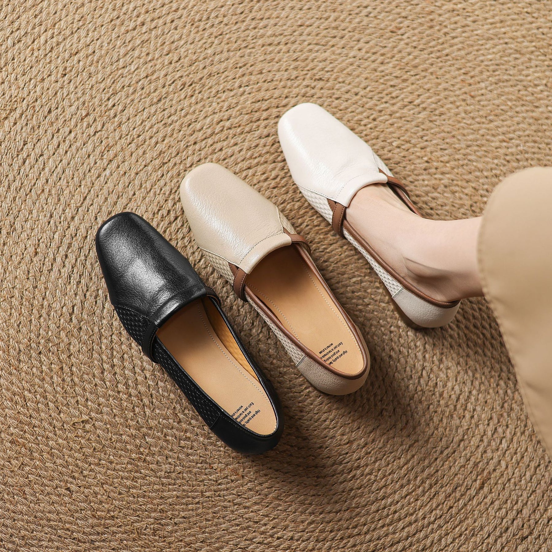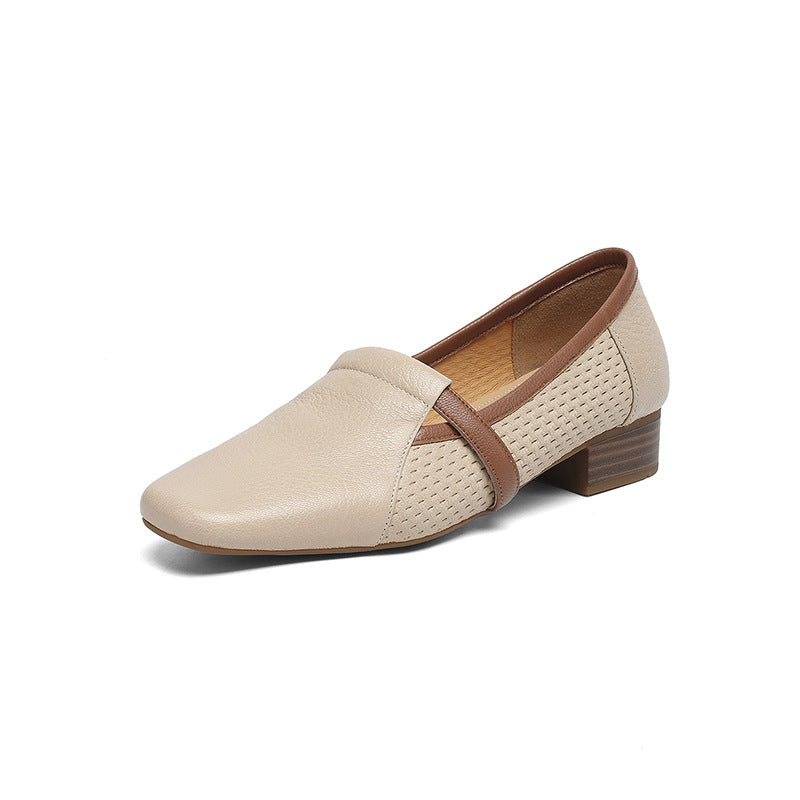 Crafted from supple genuine leather, this low-heel silhouette blends smooth and woven textures with quiet precision. A deep-cut vamp and structured form create a composed, modern profile for daily wear.